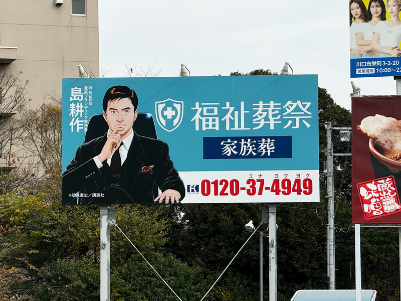 福祉葬祭 様 (埼玉県川口市) 2025.12.19 埼玉県川口市の野立看板をリニューアルしました。 福祉葬祭 様は、創業49年、年間お手伝い件数3,743件(2021年度)の実績があります。 より多くの方々にご利用いただける様に、多くの式場を有しておりますので、ご不安なことやご不明なことがございましたら、お近くの直営式場までご相談いただけます。 看板は、「社会をよくする企業応援プロジェクト」プロジェクト公式アンバサダーの島耕作が大きくよく目立つデザインで、情報はシンプルにまとまっています。 一覧に戻る