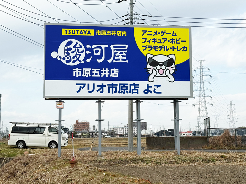 駿河屋 市原五井店 様 (千葉県千葉市) 2026.02.19 千葉県千葉市に野立看板を設置しました。 駿河屋 市原五井店 様は、精文館書店 市原五井店内で営業中です。最新から懐かしのアイテムまで幅広く取り揃え、家族みんなが楽しめるお店を目指しています。 看板は、駿河屋様のロゴが大きく分かりやすく、周囲が開けている為、青色と黄色の看板がとても良く目立ちます。 一覧に戻る